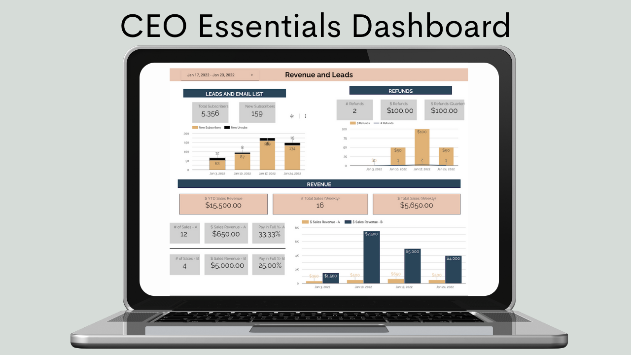 Only $47:Â This is a "Ready-to-Use" Essentials dashboard template that can be set up and customized in 30 minutes to help you understand how your business is performing.Â